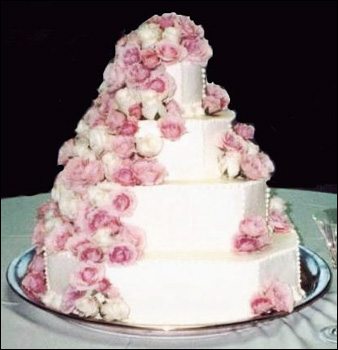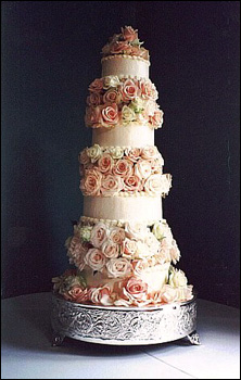 cascading flowing roses presented on a polished silver cake tray. The bride and